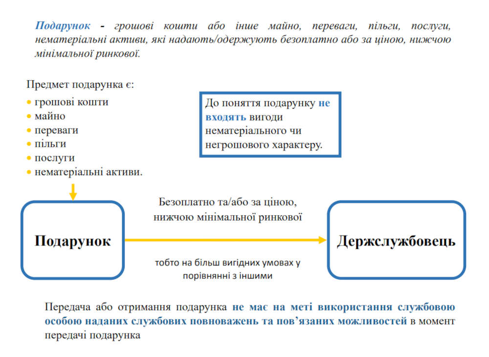 Подарунок – грошові кошти або інше майно, переваги, пільги, послуги, нематеріальні активи, які надають або отримують безоплатно чи за ціною, нижчою за мінімальну ринкову.