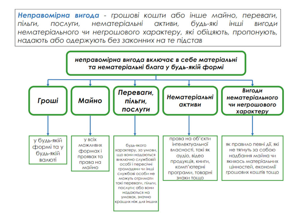 Неправомірна вигода – грошові кошти або інше майно, переваги, пільги, послуги, нематеріальні активи, будь-які інші вигоди нематеріального чи негрошового характеру, які обіцяють, пропонують, надають або одержують без законних на те підстав.