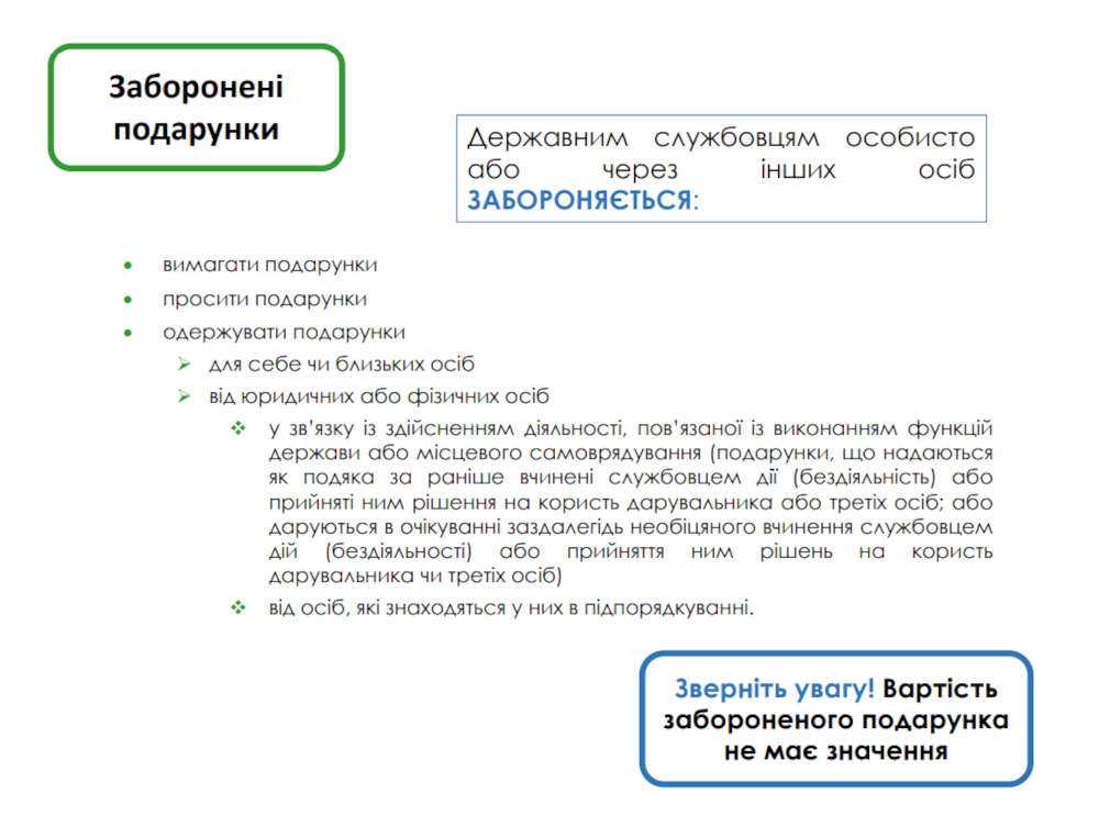 Згідно з вимогами статті 23 Закону посадовим особам забороняється прямо або через інших осіб вимагати, просити чи отримувати подарунки для себе або своїх близьких від фізичних чи юридичних осіб: